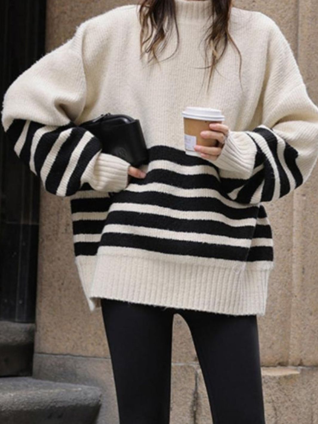 Damski sweter o luźnym kroju z długim rękawem i wyższym kołnierzem. Wzór w poziome pasy nadaje całości klasyczny charakter, a prosty fason pozwala na łączenie z różnymi elementami garderoby.
